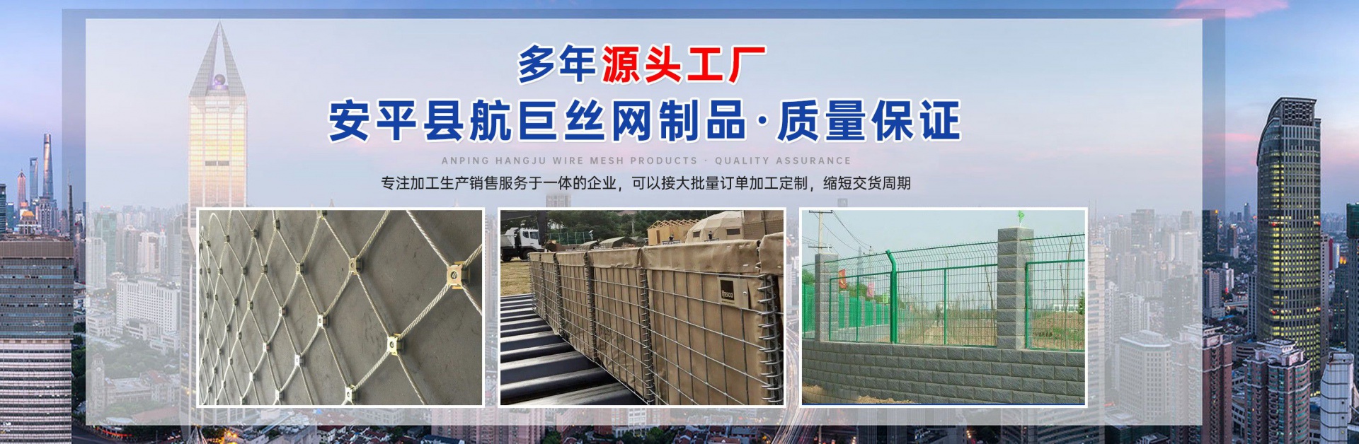 安平縣航巨絲網(wǎng)制品有限公司位于富有“絲網(wǎng)之鄉(xiāng)”美譽(yù)的—河北安平縣,此地是世界上最大的絲網(wǎng)集散基地,是華北平原上一顆璀璨的明珠。地處京、津、石三大城市中間,交通便利,是一家集生產(chǎn),加工,銷售為一體的大型絲網(wǎng)廠家。本廠專業(yè)生產(chǎn)各種類型的絲網(wǎng),類型齊全,主要包括:格賓石籠網(wǎng),雷諾護(hù)墊,麥克排水墊,加筋麥克墊,市政護(hù)欄,防爆籠,主動防護(hù)網(wǎng),被動防護(hù)網(wǎng),電焊網(wǎng)片,鋼格柵板等產(chǎn)品,形成了針對邊坡支護(hù)、基坑支護(hù)、山體邊坡綠化、鐵路、高速、公路、江河、堤壩及海塘的防沖刷保護(hù)以及水庫、河流截流等不同行業(yè)、不同規(guī)模、不同應(yīng)用的絲網(wǎng)產(chǎn)品和針對性解決方案,是國內(nèi)最有影響力的絲網(wǎng)產(chǎn)品供應(yīng)商。技術(shù)指標(biāo)達(dá)到國家同類產(chǎn)品標(biāo)準(zhǔn),可以接受較大的定單并保證質(zhì)量和生產(chǎn)期限?! 」臼冀K堅持誠信為本、質(zhì)量第一、客戶至上的經(jīng)營理念,本著互惠互利的精神,希望與國內(nèi)外朋友共同合作,為您提供優(yōu)質(zhì)的產(chǎn)品和服務(wù)。我公司在創(chuàng)新管理中求發(fā)展、創(chuàng)新經(jīng)營中求生存。把企業(yè)標(biāo)準(zhǔn)化管理、定額管理、計劃管理,公司十分注重把握市場經(jīng)濟(jì)的信息脈絡(luò),用現(xiàn)代網(wǎng)絡(luò)技術(shù),以科研開發(fā)為原動力,與科技院校及相關(guān)專家密切合作,共同研制開發(fā)21世紀(jì)適用顧客需求的相關(guān)產(chǎn)品?! “财娇h航巨絲網(wǎng)制品一直是以“質(zhì)量精良,交貨及時,價格合理,服務(wù)周到”的宗旨來為廣大客戶服務(wù);并且本著“質(zhì)...
